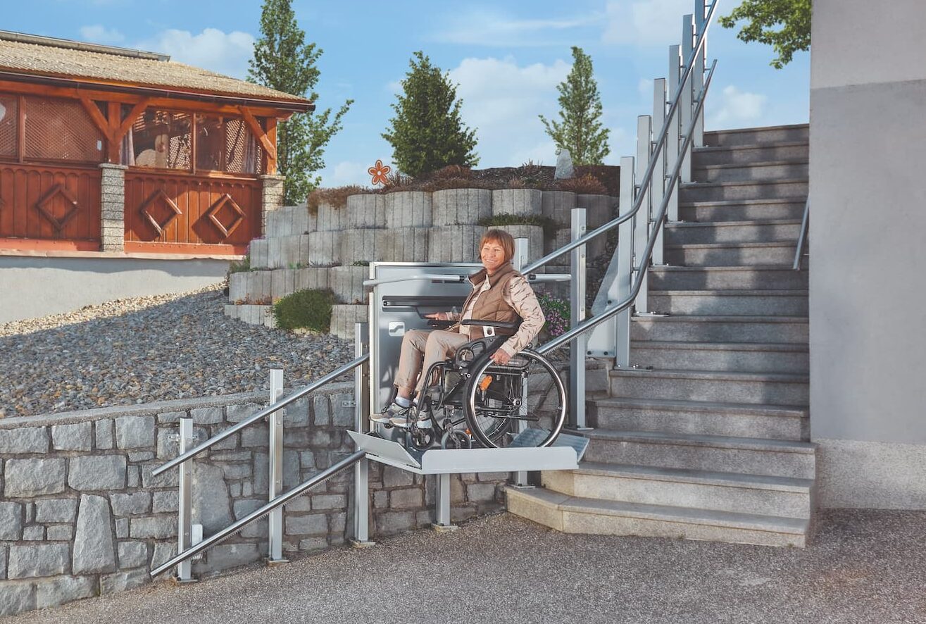 Positionnée à l’extérieur, cette plateforme permet de franchir les marches d’entrée ou d’accéder à une terrasse sans modifier l’intérieur de l’habitation. Elle est conçue pour résister aux intempéries et s’intègre discrètement à votre façade. C’est une solution pratique et rapide pour améliorer l’accessibilité d’un logement avec des accès difficiles.
