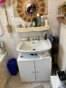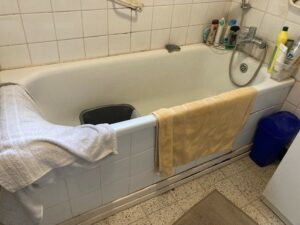 Salle de bains avant transformation, baignoire standard non adaptée PMR